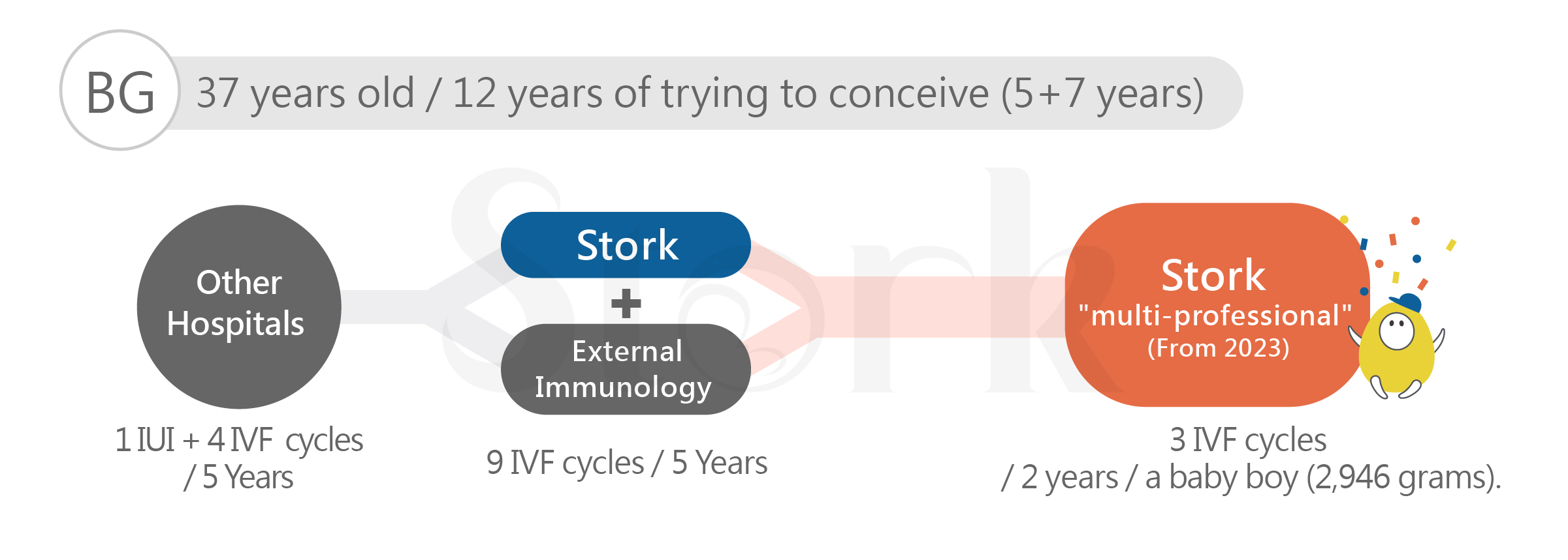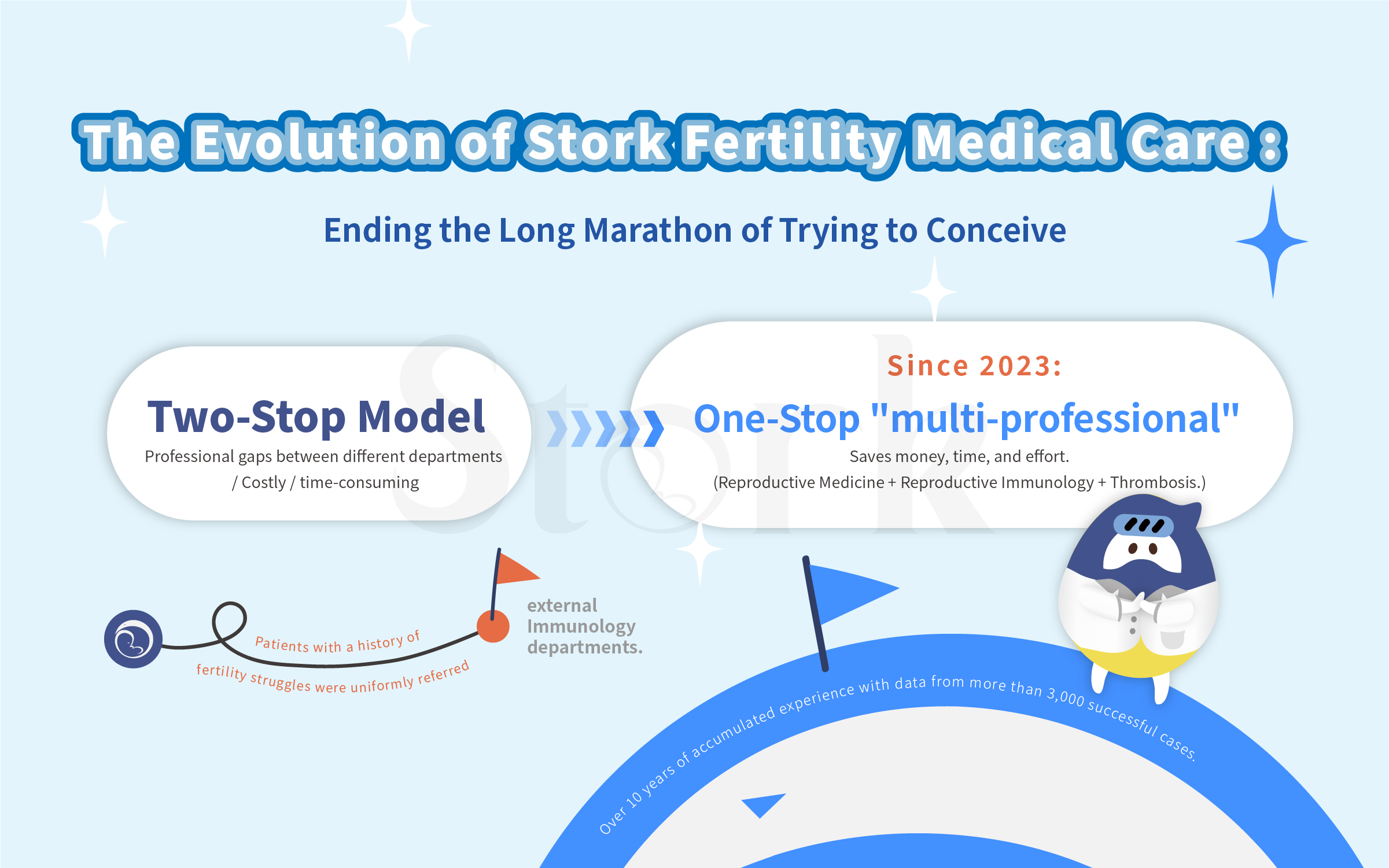 From 2016 to 2025, we have collected at least 3,000 cases . With this huge database of successful cases, Stork has redefined reproductive immunology parameters. Through having precise parameters, we have repeatedly verified its "high reproducibility" with a confidence index of up to 95%. Now, Stork becomes an globally unrivaled fertility center with every doctor specializing in three domains: reproductive medicine, reproductive immunology, and thrombosis issues.